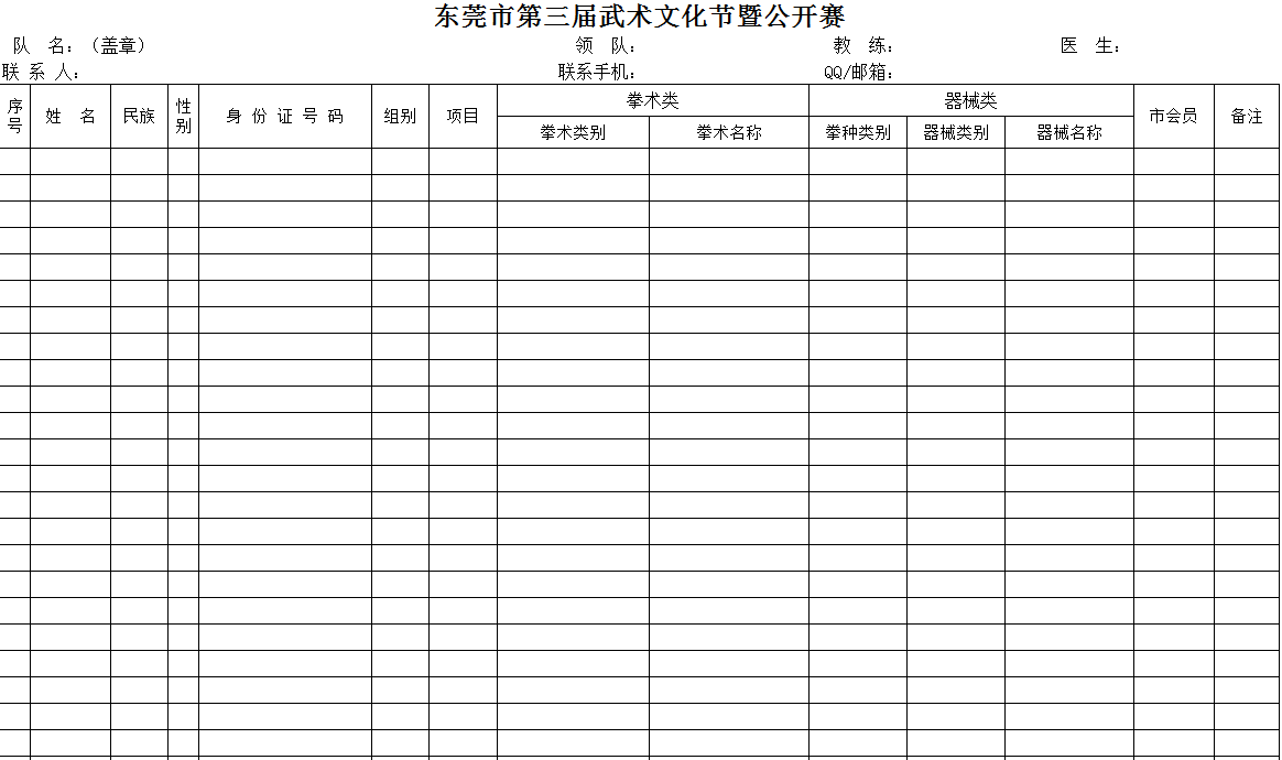 东莞市第三届武术文化节暨公开赛武术、散打报名表